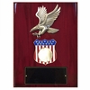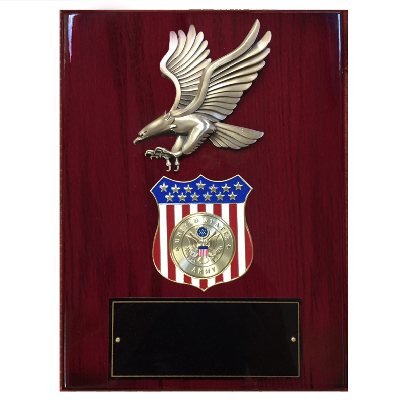 Item Description: 9 x 12 inch piano finished cherry plaque with 4 inch antique brass eagle, American flag emblem shield which holds 2 inch U.S. military insert. Comes with black and gold engraving plate.