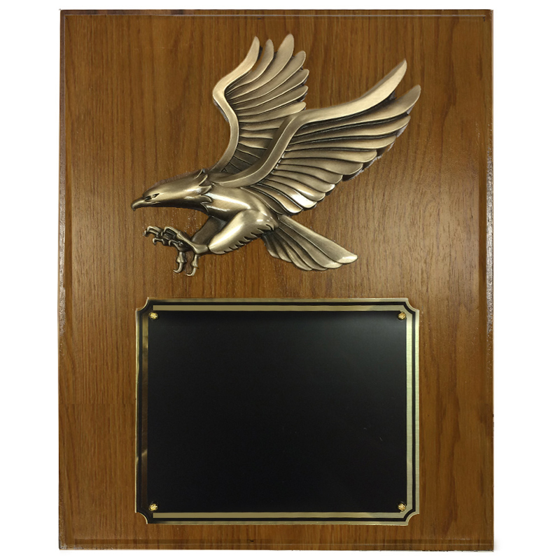 Item Description: 9 x 12 inch large size modern plaque with 6-1/4 inch antique brass eagle. Mounted on genuine walnut board. Comes with black and gold engraving plate.