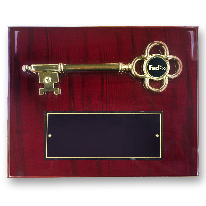 Item Description: 8 x 10 inch piano cherry finished board gold key plaque holds 1 inch black disc insert to be laser engraved. Comes with black and gold engraving plate.