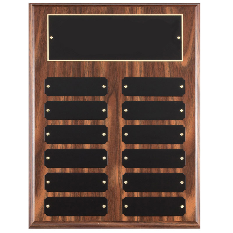 Item Description: 9" x 12" inch perpetual Walnut finish plaque. Comes with black and gold screened header plate and 13 small name plates. Plate size: 3-1/4" x 1"