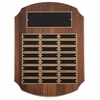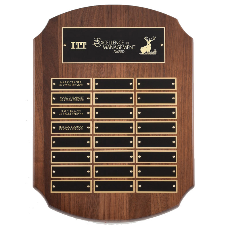 Item Description: 11" x 15" inch perpetual genuine Walnut shield plaque. Comes with black and gold screened header plate and 24 small name plates. Plate size: 2-3/4" x 7/8".
