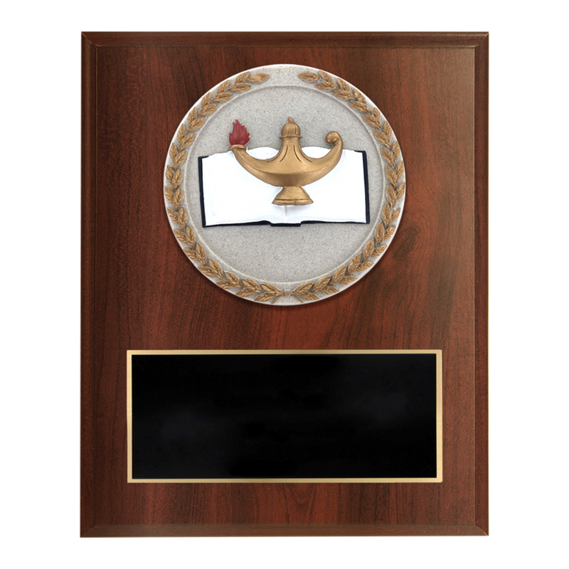 Item Description: 6 x 8 inch dark cherry finish wood lamp of learning plaque with a 4 inch mounted 3-dimensional lamp of learning stone resin casting. Comes with a 3 x 5 inch black and gold bordered engraving plate which can be personalized with up to 3 lines of text, 40 characters per line.