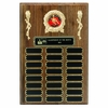 Item Description: 8 x 10 inch walnut finish plaque comes with 6 x 8 inch frosted borders color plate.Item Description: 9 x 12 inch walnut finish multiple plate plaque with twelve 2-1/2 x 7/8 inch black screened name plates for laser engraving, two metal torches, and a stamped metal wreath holding a 2 inch medallion insert.