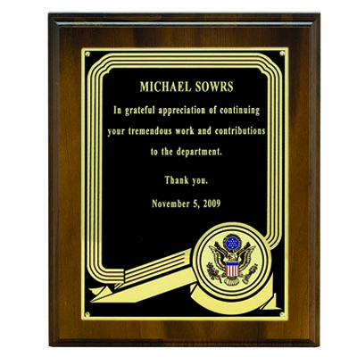 Item Description: 8 x 10 inch walnut finish plaque comes with black screened plate, and takes 2 inch medallion insert.