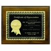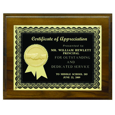 Item Description: 8 x 10 inch walnut finish plaque comes with 6 X 8 inch laser able black screened brass plate and add-on 2 inch stamped insert.