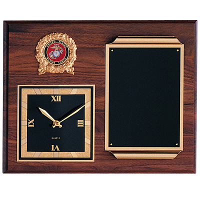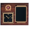 Item Description: 12 x 15 inch genuine walnut plaque comes with quartz clock, laser able black screened brass scroll plate, and takes 2 inch medallion insert.