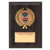 Item Description: 5 X 7 inch simulated walnut finish plaque with gold aluminum plate, plastic wreath and takes 2 inch medallion insert.