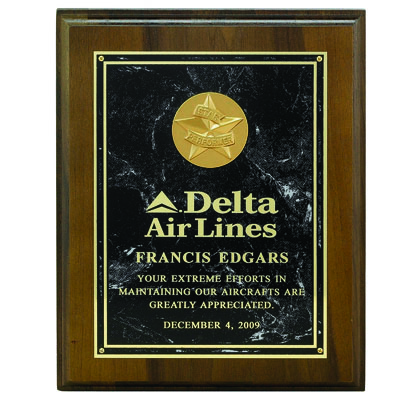 Item Description: 9 x 12 inch genuine walnut plaque comes with colored screened marbleized plate, and takes 2 inch medallion insert.