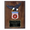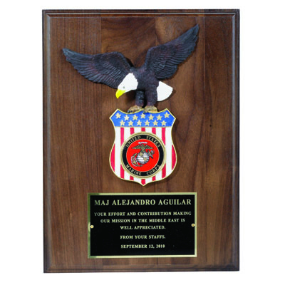 Item Description: 9 x 12 inch walnut finish plaque comes with 3 x 5 inch black screened plate, modeled resin eagle mount and takes 2 inch medallion insert.