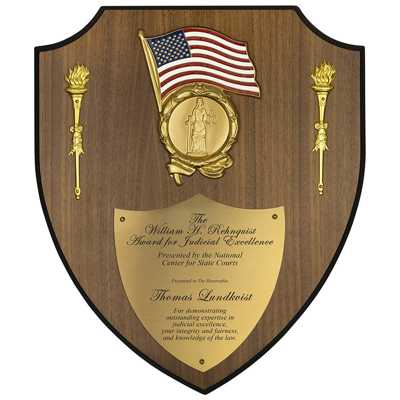 Item Description: 11 x 13 inch walnut veneer shield shape plaque with American flag, metal torches and brass metal shield shape plate. Amercian wreath holding interchangeable 2 inch medallion insert. The brass shield plate can be mechanically engraved with a diamond drag cutter.