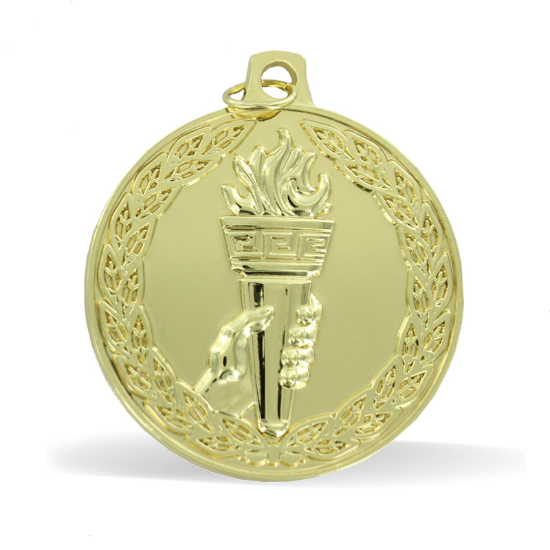This 2 inch die-struck medal is available in gold and the front face depicts a lit torch held up by a hand with a wreath around the inner perimeter. The back face of the medal can be engraved or imprinted. - IMPRINTING COPY MUST ALL BE THE SAME.