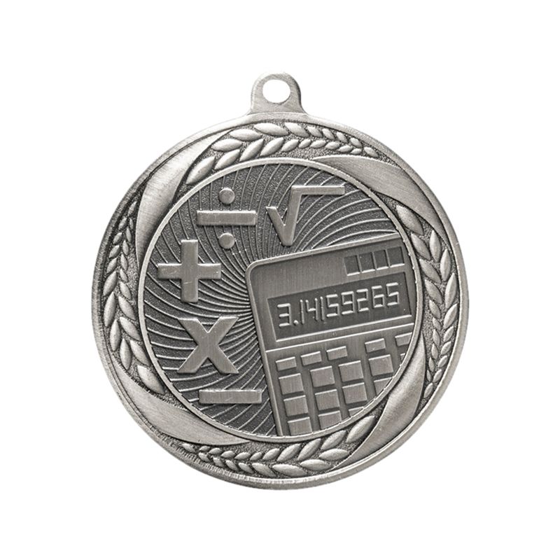 This 2-1/4 inch mathematics medal is engraved on its frontside with imagery depicting a calculator and several mathematical functions encompassed by an ornate and detailed laurel wreath border. The backside of the medal has space for an optional two inch insert, or a custom engraving or imprint. The medal is available in gold, silver, or bronze with an antique finish.