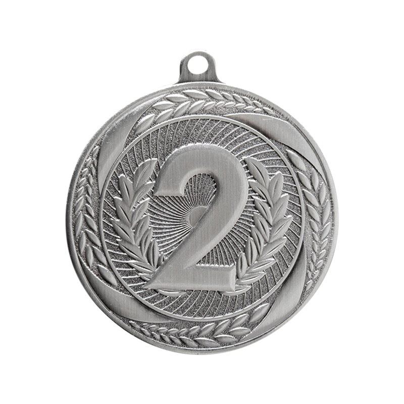 Perimetered by an ornate laurel wreath border sits a large wreathed '2' engraving that occupies the front face of this 2-1/4 inch medal. The back face of the medal has enough space for an optional two inch insert or custom engraving or imprint, and the medal is available only in silver with an antique finish.