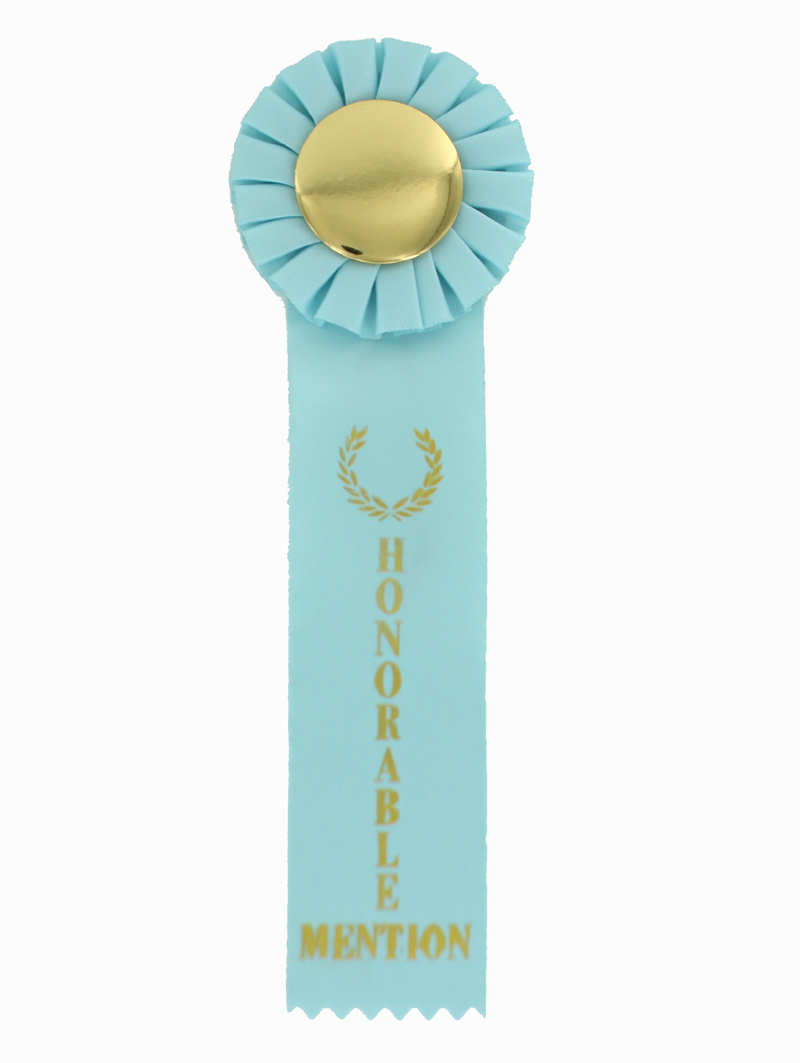 Item Description: 3 inch stock rosette, 2 inch x 10 inch single streamer, 2 inch Mylar hologram medallion.