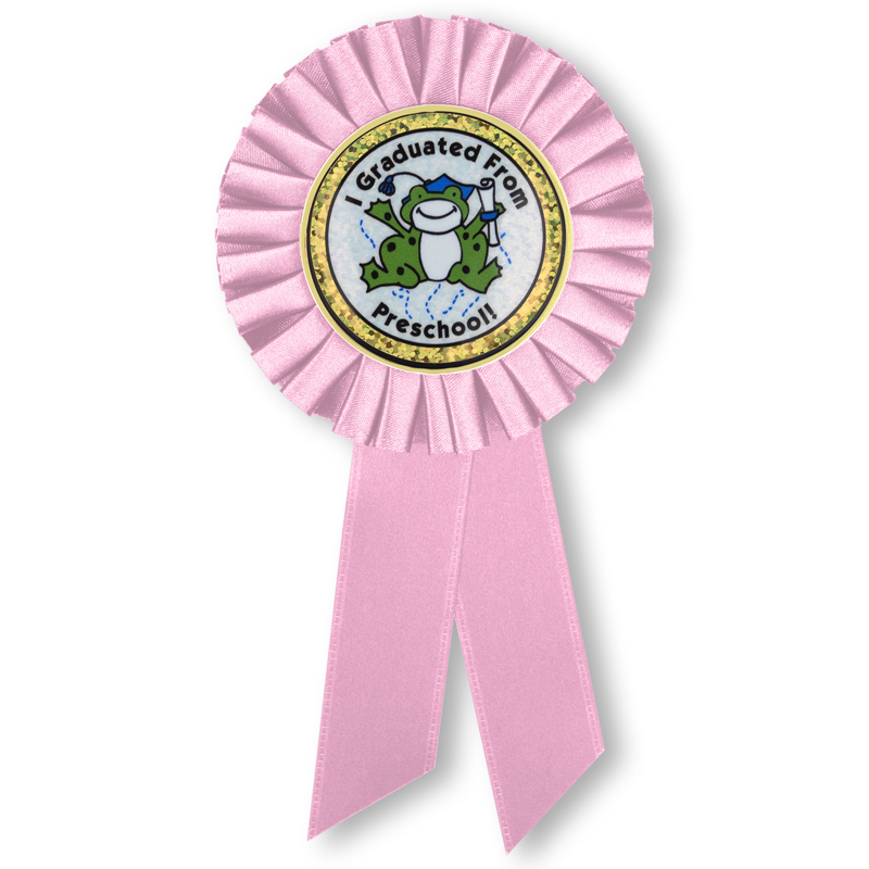 Item Description: Large pink rosette ribbon with 2 inch "I Graduated From Preschool!" bright hologram mylar insert. Recognition card on back side with name, date, and event lines for personalization. Ribbon measures 6-1/2 (height) x 3 (width) inches, comes poly bagged, and has an adhesive sticker on back for attachment and added safety.
