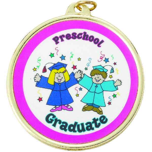 Printed in Mylar onto the front of this 2-1/4 inch in diameter gold medal is an image of two children throwing confetti, as well as 'Preschool Graduate' written around them, and a pink border that encompasses the image. The back of the medal can be custom engraved or imprinted, and it is available only in gold.