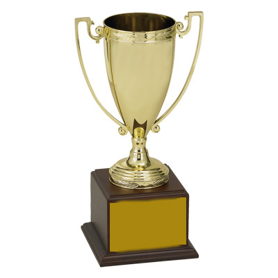 Item description: 17-1/2 inch trophy comes with 13 inch heavy gold metal cup on walnut wood base, and 3-1/2 x 1-7/8 inch gold plate.