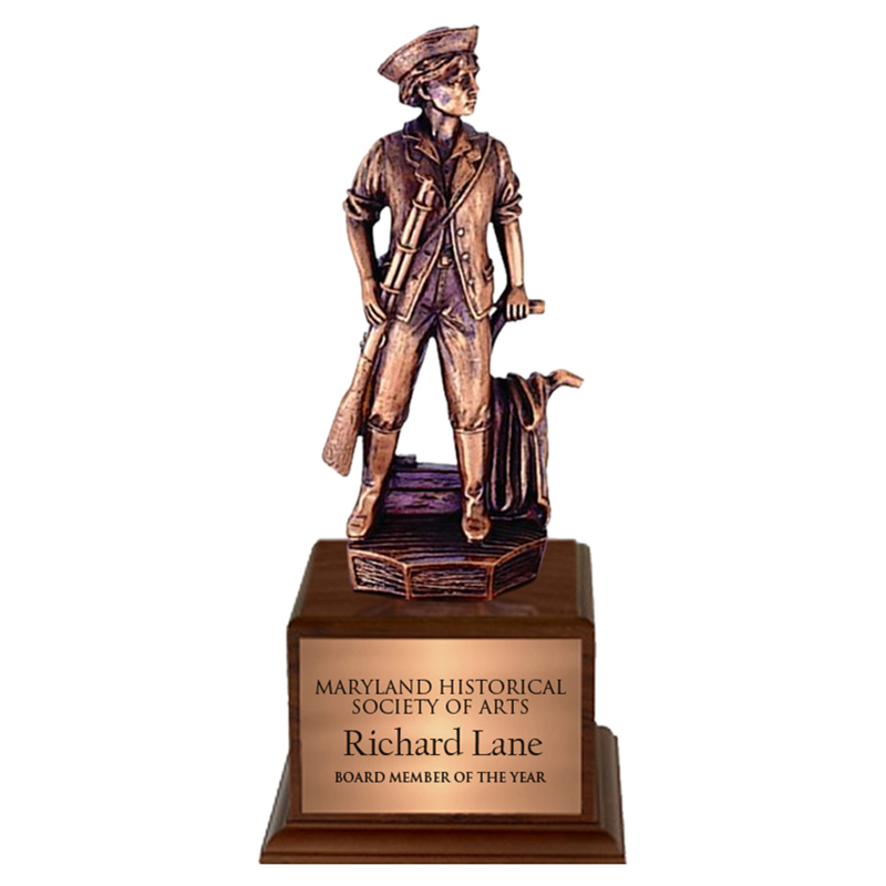 Item Description: 10-3/4 inch (height) antique bronze electroplated minuteman trophy mounted on walnut finish base. Figure measures 7 inches and height of base measures 3-3/4 inches, making total height of award 10-3/4 inches. Comes with brass laser engraving plate.
