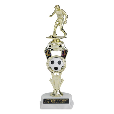 Item description: 12-1/2 inch sports trophy with soccer spinner takes soccer figure.