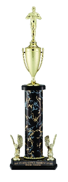 Item description: 21-1/2, 22-1/2, 23-1/2 inch one column gold and black marbleized trophy comes with cup, 2 eagle trims and changeable figure.