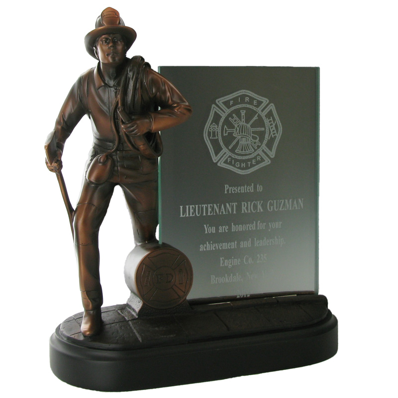 Item Description: 8-1/4 inch height bronze electroplated firefighter trophy figure on black base, comes with 4 x 6 inch glass insert.