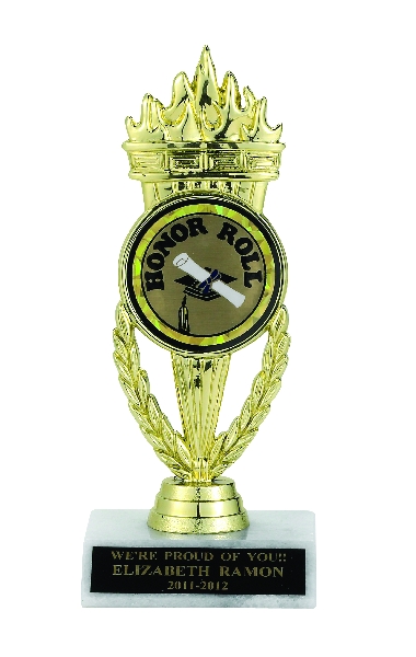 Item description: 7-1/4 inch Torch Trophy with white plastic base, holds 2 inch Mylar insert. Additional price for medallion insert will vary depending on selected insert. The image shown above represents the finished product.