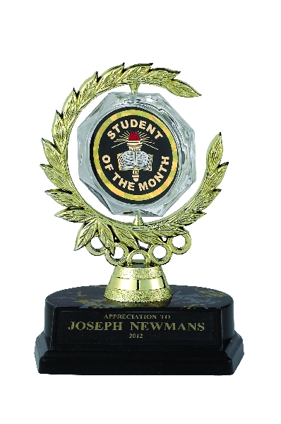 Item description: 6 inch spinner wreath trophy with black marbleized base, holds 2 inch Student of the Month medallion insert. The image shown above represents the finished product.