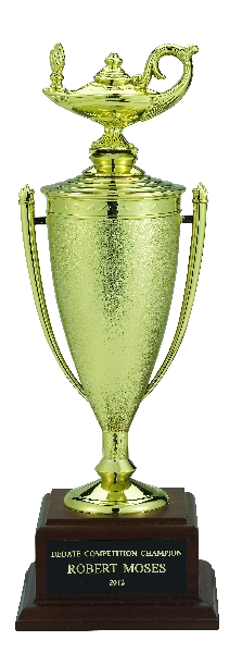 Item description: 12-1/2 inch Lamp Of Learning Gold Trophy Cup with walnut finish base. The image shown above represents the finished product.