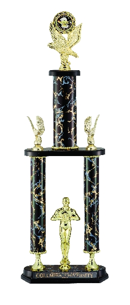 Item description: 28, 30, 32 inch three column black and gold marbleized base trophy comes with cup and eagle trims. Riser, figure and 2 inch medallion insert are interchangeable.