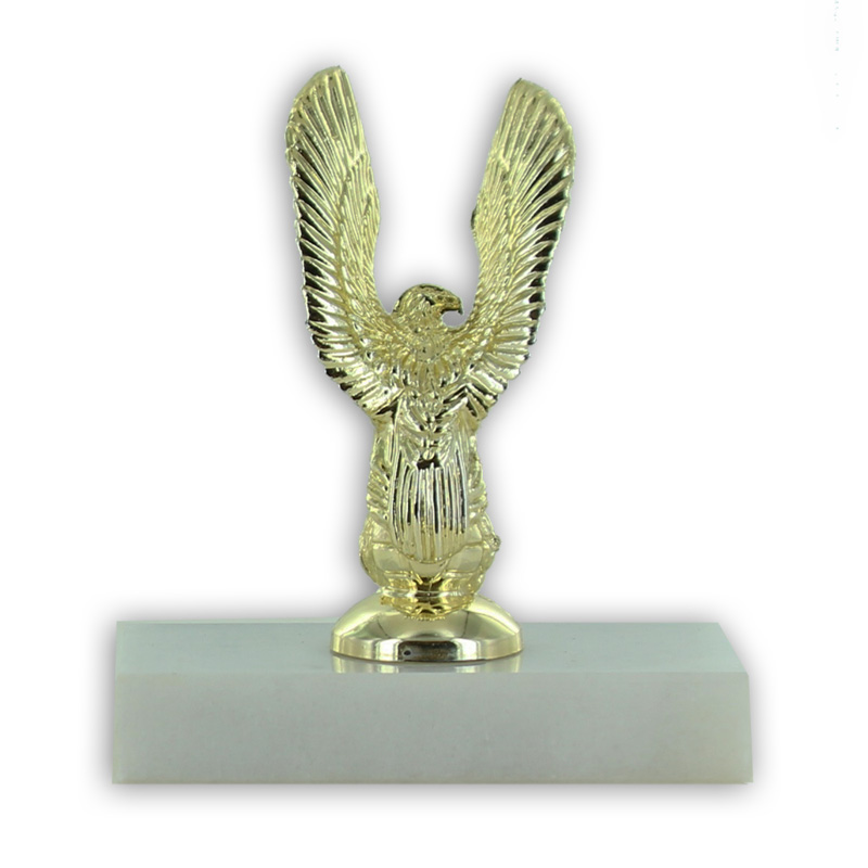 Item description: 4-1/2 inch soaring eagle trophy on a front slanted white plastic base.