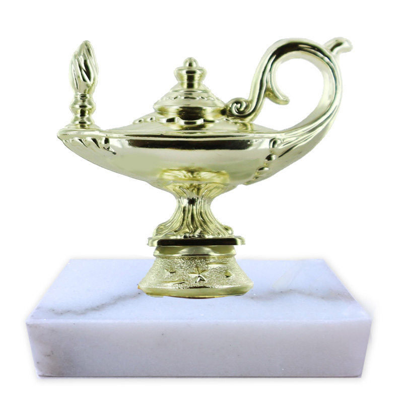 Item Description: 3-3/4 inch total height Lamp of Learning trophy on white marble base. Base dimesion is 2 x 3-1/2 inch.