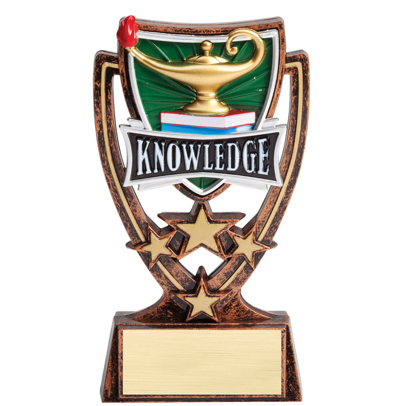 Item description: 6 inch plastic injected molded Knowledge trophy. Comes with matte gold engraving plate.