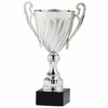 Item description: 10-1/4 inch trophy height swirl silver metal trophy cup on a black marble base. Comes with 2-1/2 x 1 inch matte silver engraving plate.