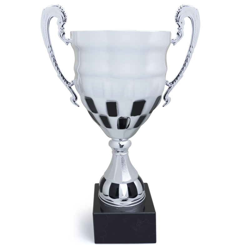 Item Description: 14-1/2 inch checkerboard stale silver metal trophy cup with black accents, plastic stem, and black marble base with silver plate. Base is 4 x 1-3/4 inches.