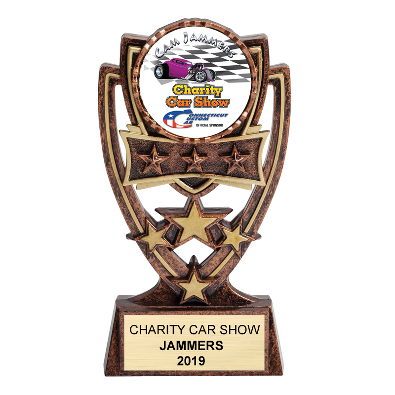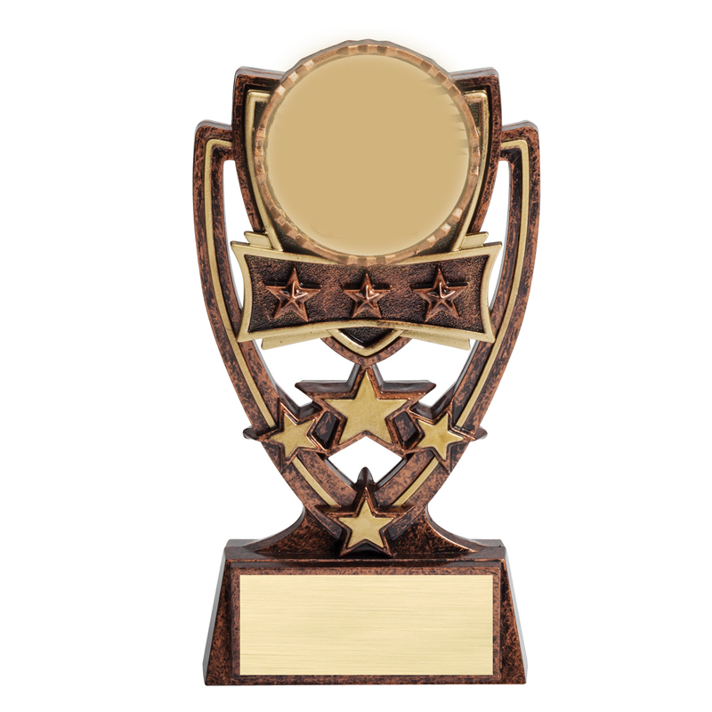 Item description: Star trophy with weighted molded plastic holds 2 inch insert. Comes with matte gold engraving plate. Trophy size is 6 inches (from top to bottom)