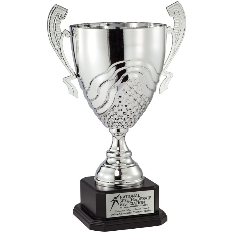 Item Description: Bright silver metal trophy cup with swirl and grid design mounted on a black marble base. Trophy cup height is 19-1/4 inches, comes with matte silver engraving plate. Engraving plate can be personalized with up to 6 lines of text, 30 characters per line.