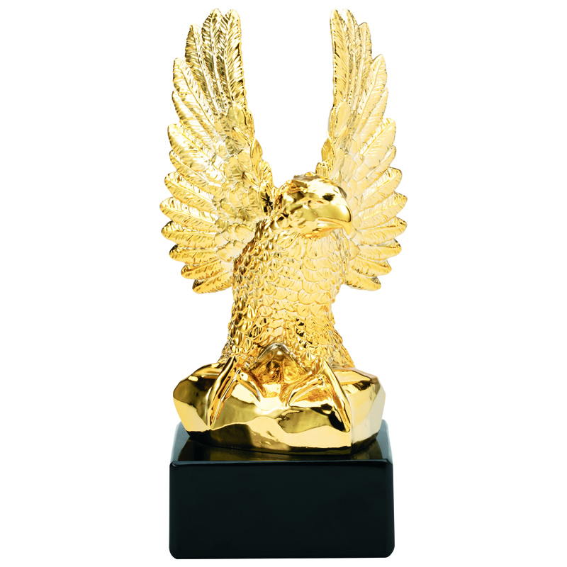 Item Description: Bright gold resin eagle trophy mounted on black marble base. Comes with a matte gold plate for engraving. Trophy height is 10-1/2 inches.