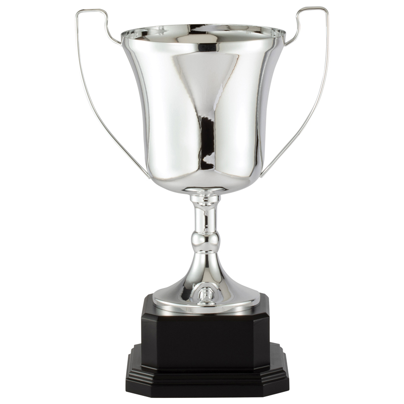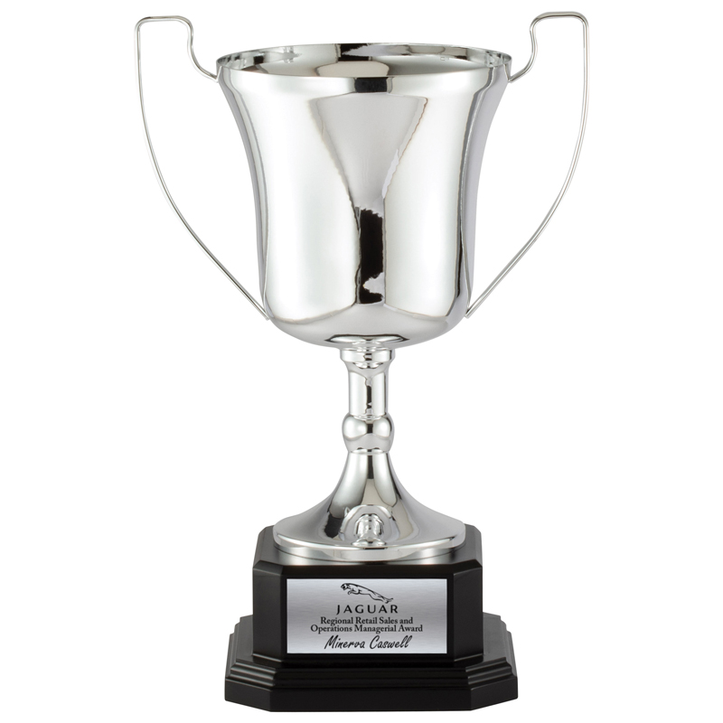 Item Description: Italian style trophy cup with silver metal finish mounted on ebony wood base - comes with a matte silver plate. Cup and base height is 14 inches and plate size is 3-1/2 x 2 inches.