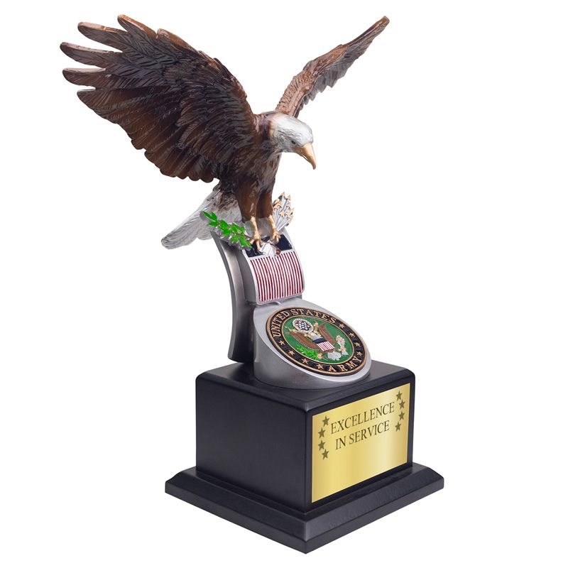 Item Description: 14 inch (total height) hand painted U.S. Army eagle on a black base with the Army shield emblem below. The eagle figure has a height of 10 inches and a wing span of 12 inches. Below the eagle is a hand painted U.S. Army shield emblem. The eagle is mounted on a black wood base that measures 6 (width) x 4 (height) inches. Includes a gold plate engraved with "Excellence In Service" with space for personalization. Plate measures 4 (width) x 3 (height) inches. Total height of trophy including the eagle and the base is 14 inches.
