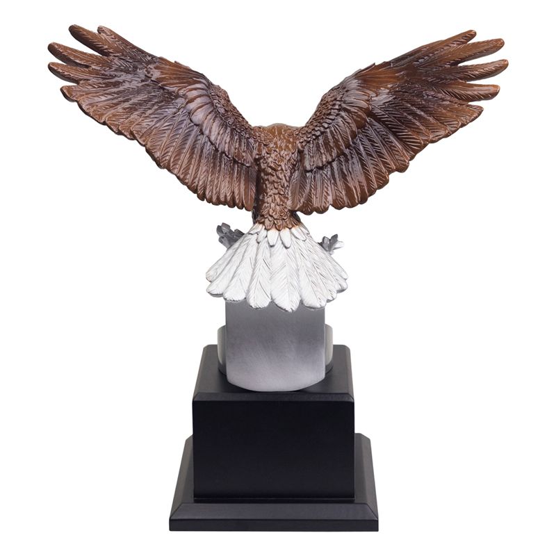 Item Description: 14 inch (total height) hand painted U.S. Army eagle on a black base with the Army shield emblem below. The eagle figure has a height of 10 inches and a wing span of 12 inches. Below the eagle is a hand painted U.S. Army shield emblem. The eagle is mounted on a black wood base that measures 6 (width) x 4 (height) inches. Includes a gold plate engraved with "Soldier Of the Month" with space for personalization. Plate measures 4 (width) x 3 (height) inches. Total height of trophy including the eagle and the base is 14 inches.