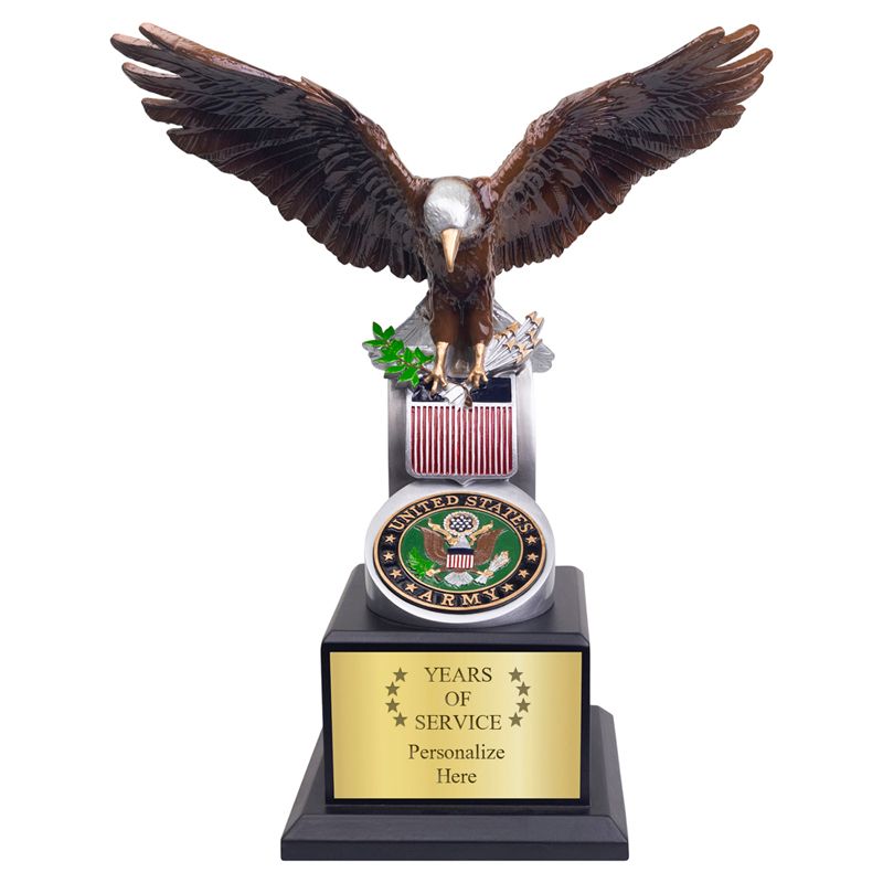 Item Description: 14 inch (total height) hand painted U.S. Army eagle on a black base with the Army shield emblem below. The eagle figure has a height of 10 inches and a wing span of 12 inches. Below the eagle is a hand painted U.S. Army shield emblem. The eagle is mounted on a black wood base that measures 6 (width) x 4 (height) inches. Includes a gold plate engraved with "Years of Service" with space for personalization. Plate measures 4 (width) x 3 (height) inches. Total height of trophy including the eagle and the base is 14 inches.