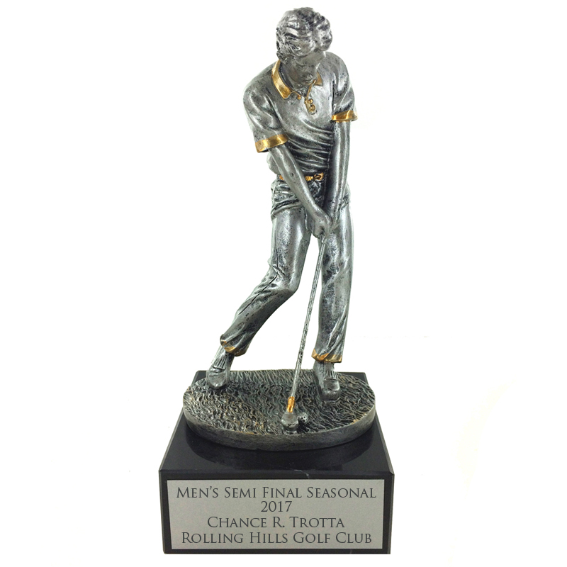 Item description: Antique silver male figure golfer trophy with gold trim on black marble base. Trophy height is 10-1/2 inch. Comes with matte silver engraving plate.