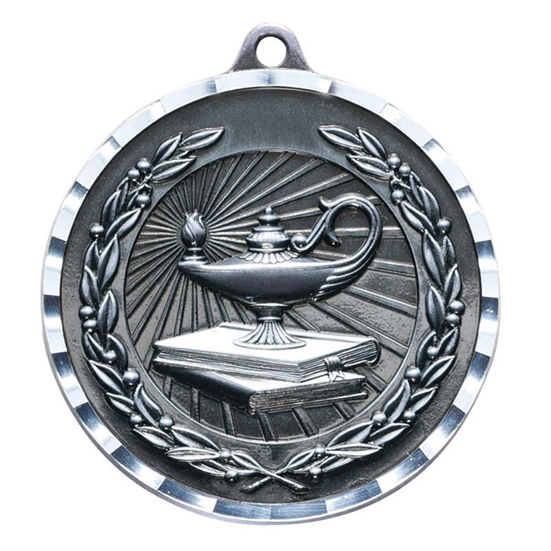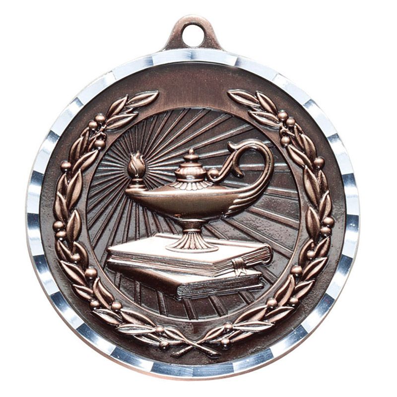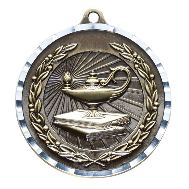 The front face of this 2-3/4 inch academic medal is engraved with an image of a gleaming 'lamp of learning' atop a set of books, all encompassed by a laurel wreath that follows the medals diamond-cut border. The back face of the medal has space for a custom engraving or imprint, and the medal is available in brass, pewter, or bronze, each with an antique finish in cast satin.