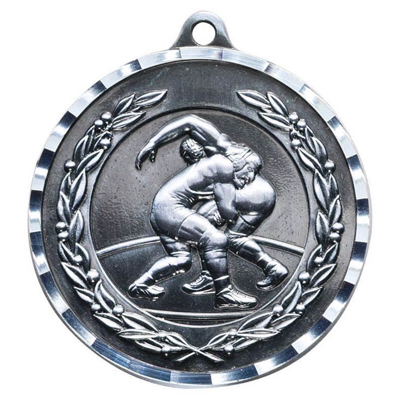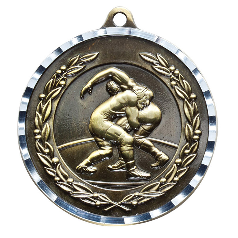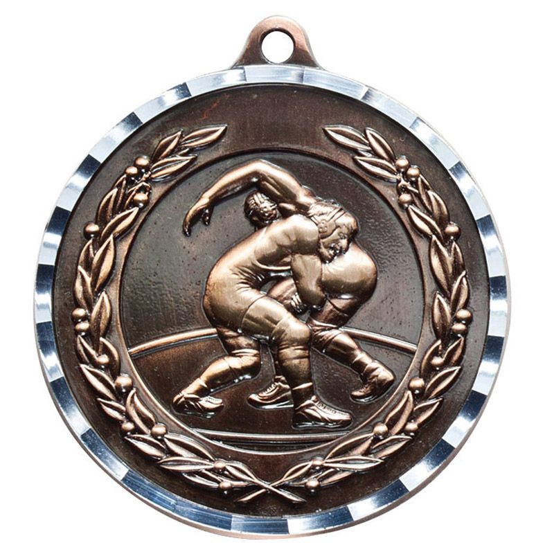 The front face of this 2-3/4 inch sports medal is engraved with an image of two wrestlers competing within a wrestling ring encompassed by a laurel wreath that follows the medals diamond-cut border. The back face of the medal has space for a custom engraving or imprint, and the medal is available in brass, pewter, or bronze, each with an antique finish in cast satin.