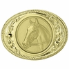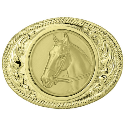 Item description: 2-3/4 inch x 3-5/8 inch oval die cast zinc belt buckle holds 2 inch gold medallion insert.