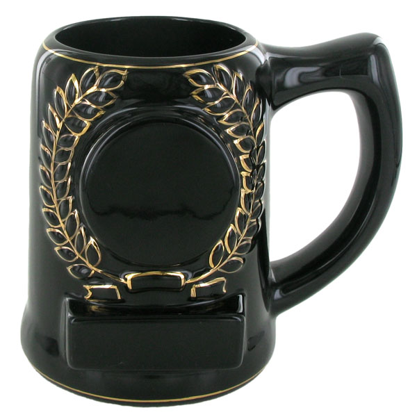 Item description: 28 ounce black ceramic beer mug without 2 inch medallion insert and brass engraving plate.