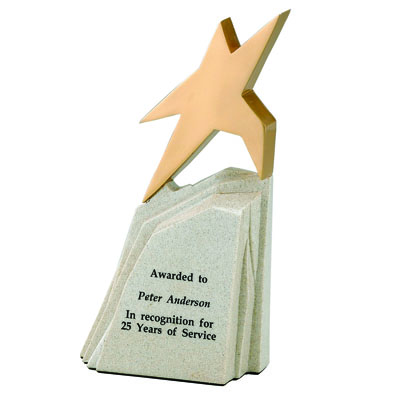 8 1/2 inch x 4 1/2 inch resin trophy rising star on rocks.