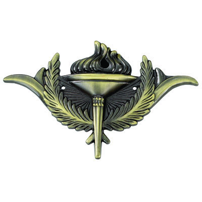 5-1/2 inch x 3-3/8 inch die cast plaque mount torch and wreath, antique brass finish,