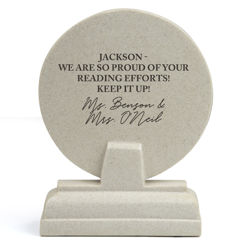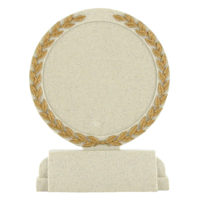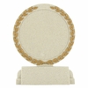 Item Description 5 1/2 inch x 4 inch cast stone trophy with plain center. Holds 3 inch disk and 3 inch x 1 inch plate.