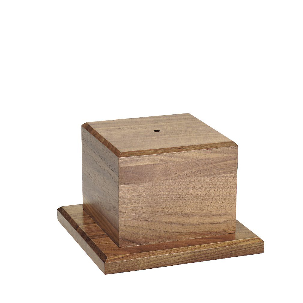 Item Description: Hand rubbed genuine American walnut base for cup bowl figure. Base dimensions: 4 x 4 x 3/4 inch. Block dimensions: 2-3/4 x 2-3/4 x 1-1/2 inch. Platform: 2-3/8 x 2-3/8 inch.